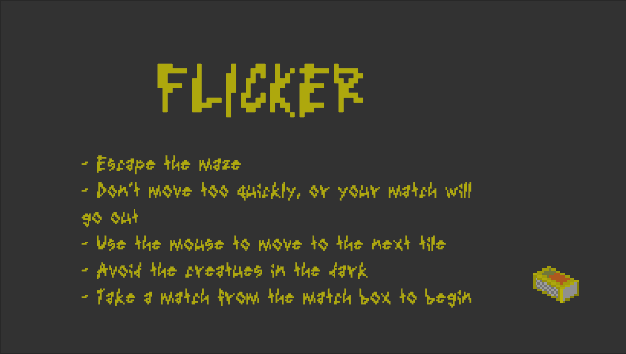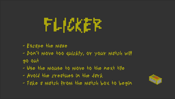 A short, arcade-style horror game about escaping an ever-shifting maze. Armed with only a handful of matches, you must avoid the creatures lurking in the dark and find the exit. But don’t rush, because if you move too quickly, your fragile flame and your hopes of survival, will extinguish.